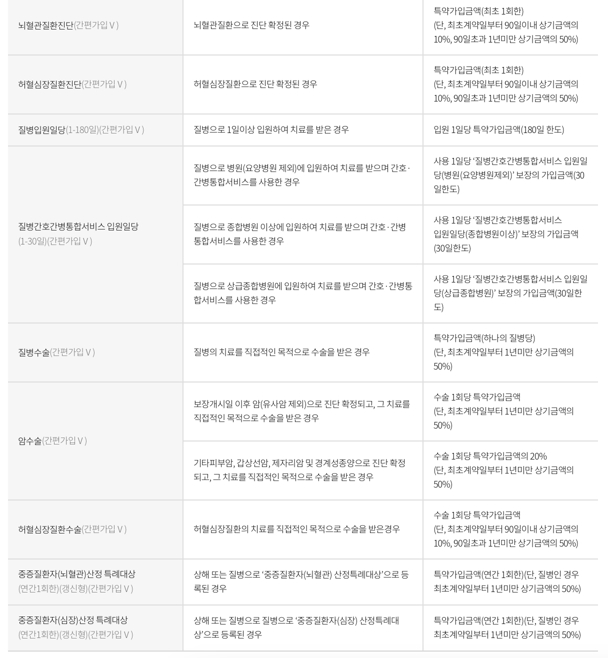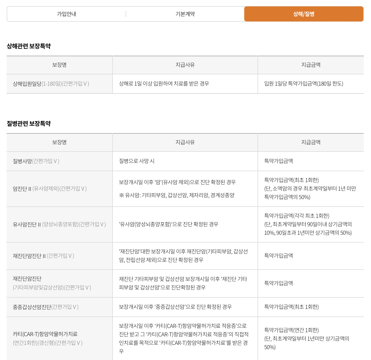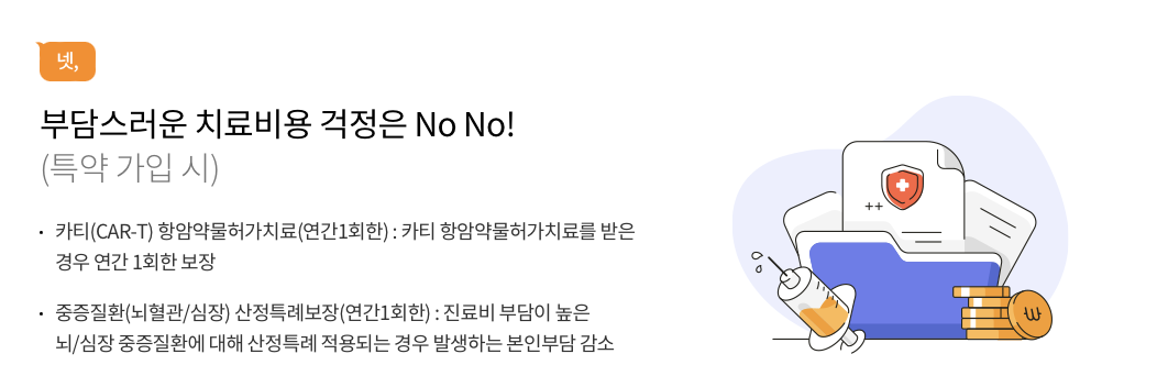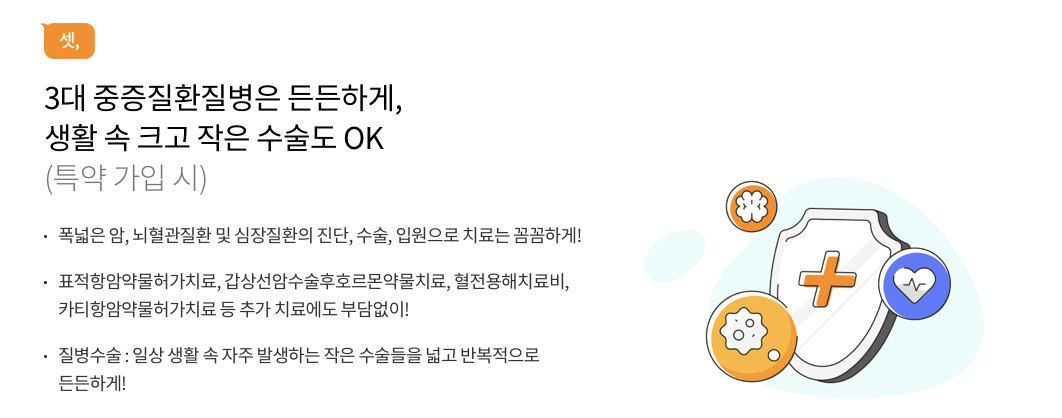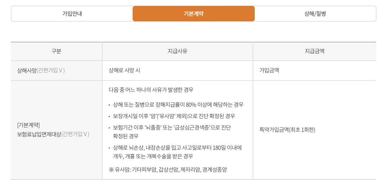 - 간편가입특약: 암특약, 뇌혈관질환특약, 심장질환특약을 한 번에 가입할 수 있습니다.