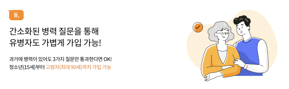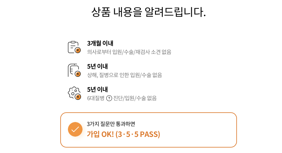 - 간편한 가입: 3개월 이내 의사로부터 입원/수술/재검사 소견 없음, 5년 이내 상해, 질병으로 인한 입원/수술 없음, 5년 이내 6대질병 진단/입원/수술 없음을 충족한 경우, 간편하게 가입할 수 있습니다.