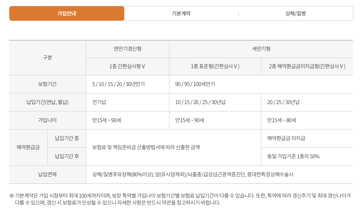 - 암특약, 뇌혈관질환특약, 심장질환특약 등은 별도의 특약 가입이 필요합니다.