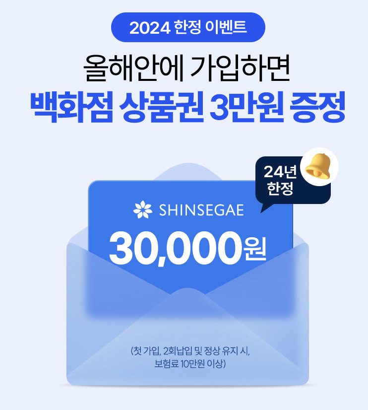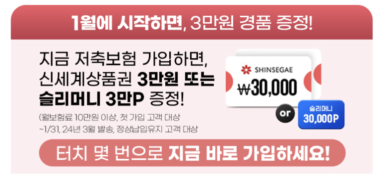 삼성생명 다이렉트에서 뉴연금보험, 저축보험2.2, 종합건강보험 일당백, 다(多)Dream건강보험 등 금융, 건강상품을 최초 가입하고 2회차 납입 및 정상 유지 시 3월에 신세계 상품권 또는 슬리머니 3만원을 증정합니다.