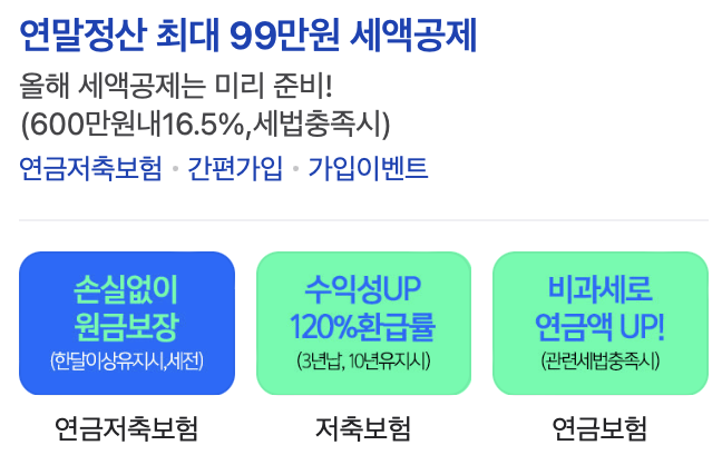 삼성생명 인터넷저축보험은 연금저축보험으로, 연말정산 시 세액공제 혜택을 받을 수 있습니다. 따라서, 연말정산 환급을 받고자 하는 분들은 삼성생명 인터넷저축보험을 고려해 볼 수 있습니다.