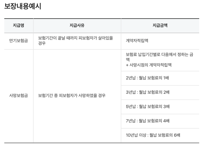 - 만기보장 : 보험기간이 만료되는 시점에 만기보험금을 지급합니다.