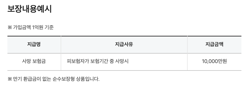 | 사망보장 | 보험료 납입 기간 중 피보험자가 사망한 경우, 계약자 또는 피보험자 지정자가 정해진 보험금을 받는다. |