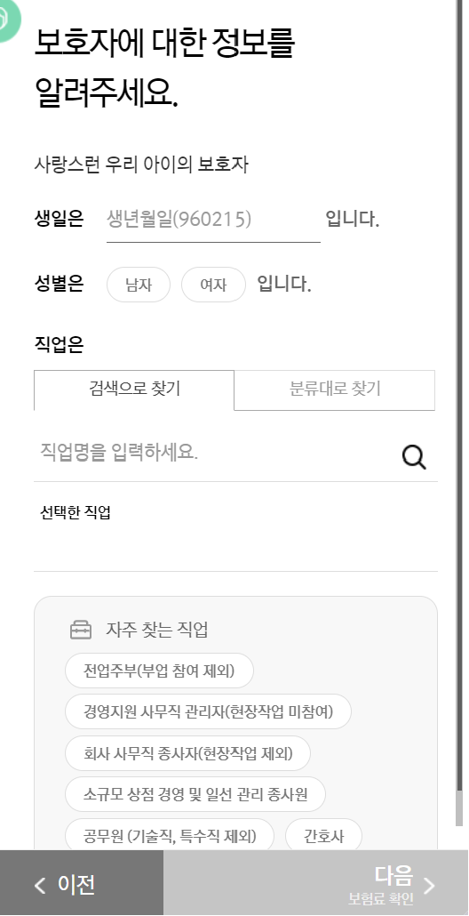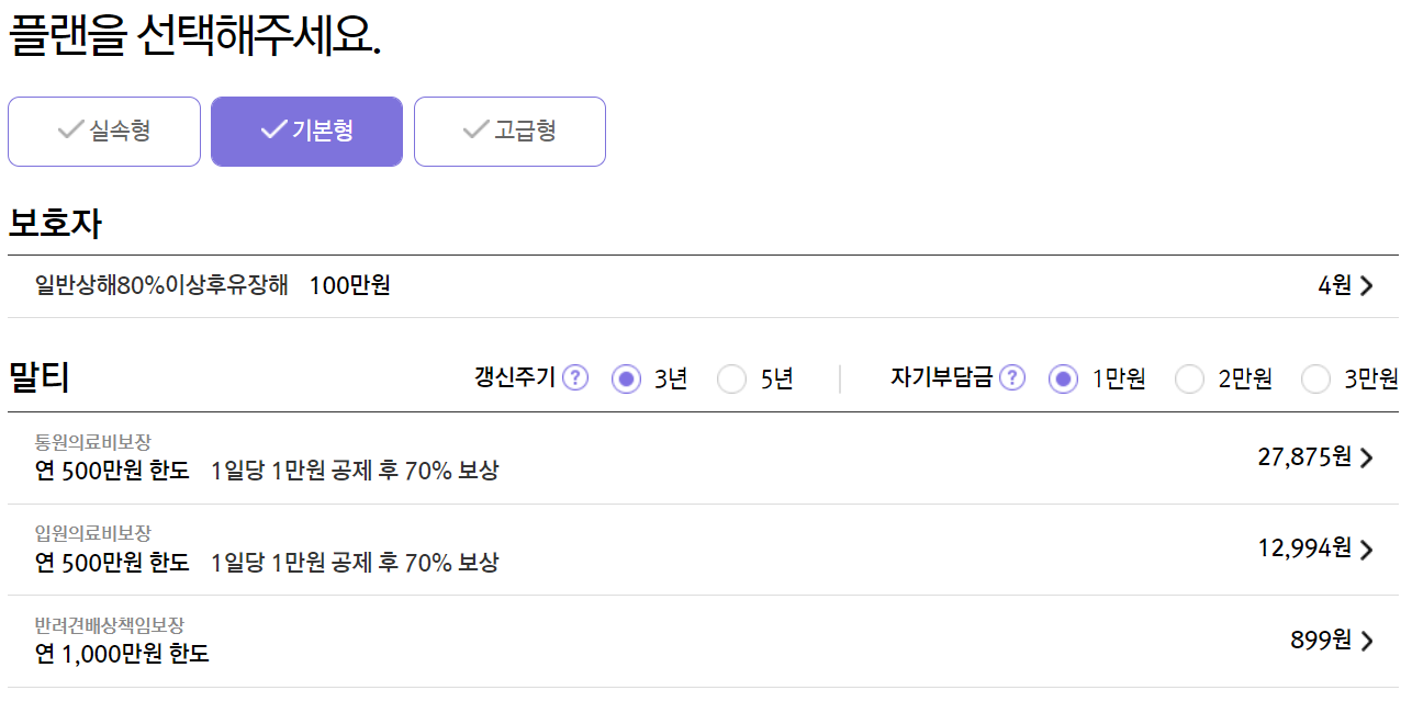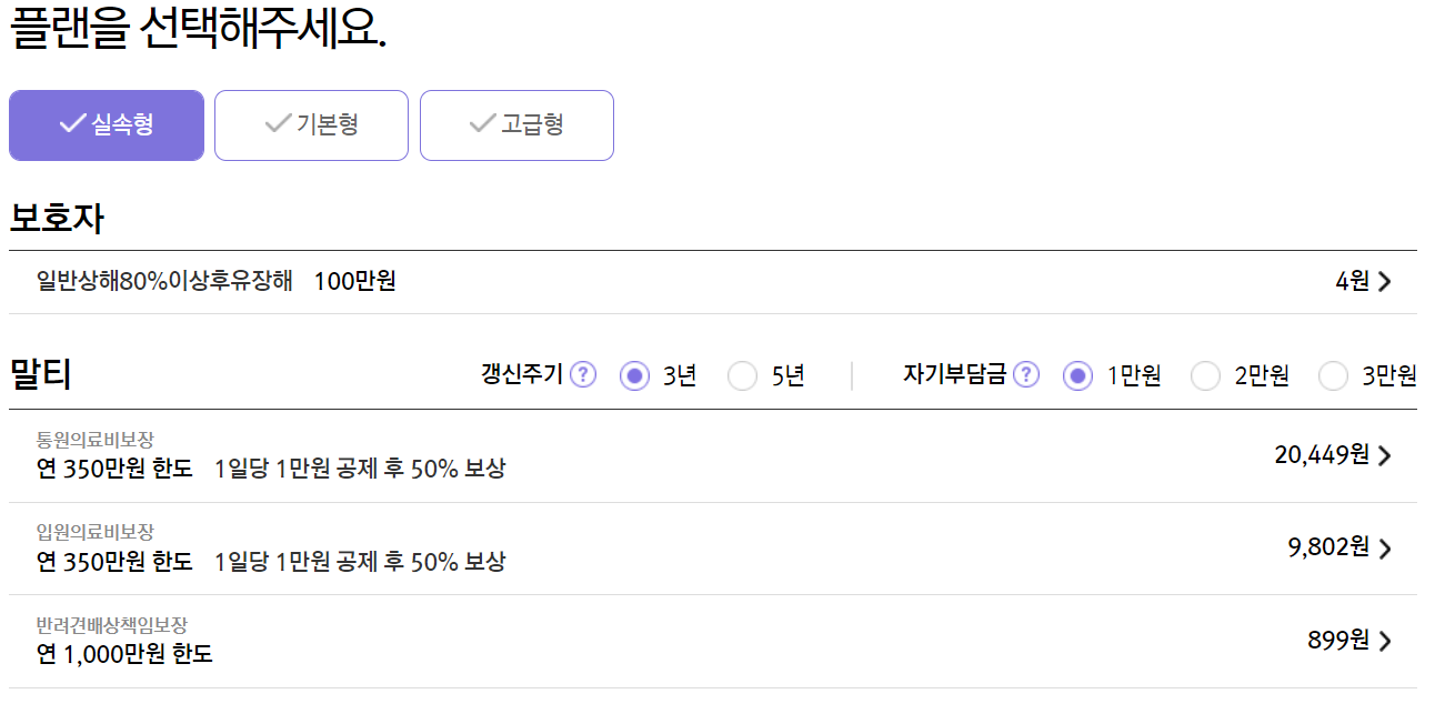 보호자분 정보를 입력합니다. 그럼 바로 다음과 같이 보험료가 조회됩니다. 보험 플랜은 실속, 기본, 고급형이 있습니다.