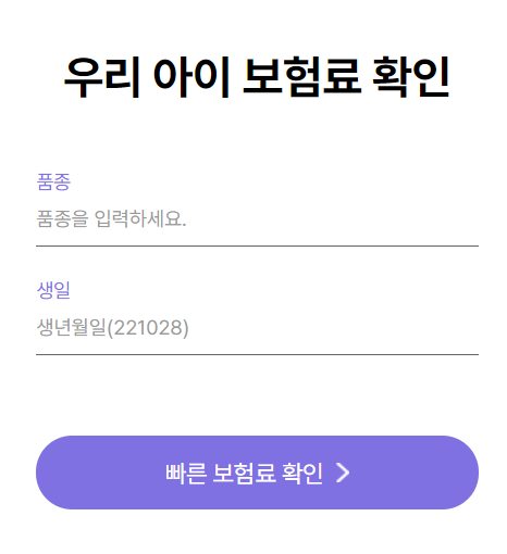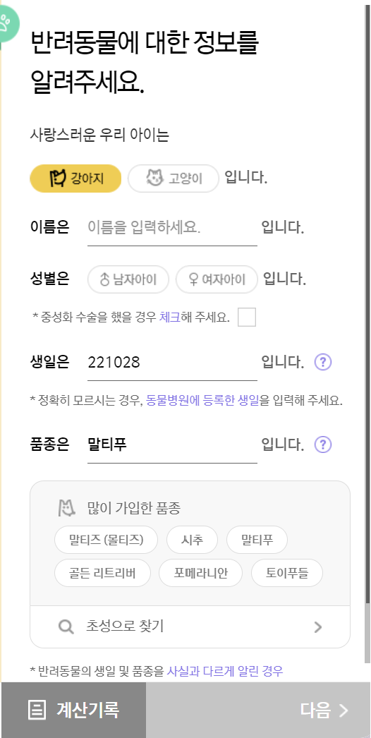 품종 및 생일을 입력한 뒤 빠른 보험료 확인을 클릭합니다.