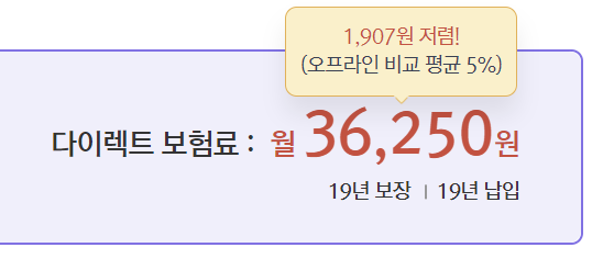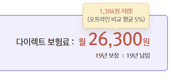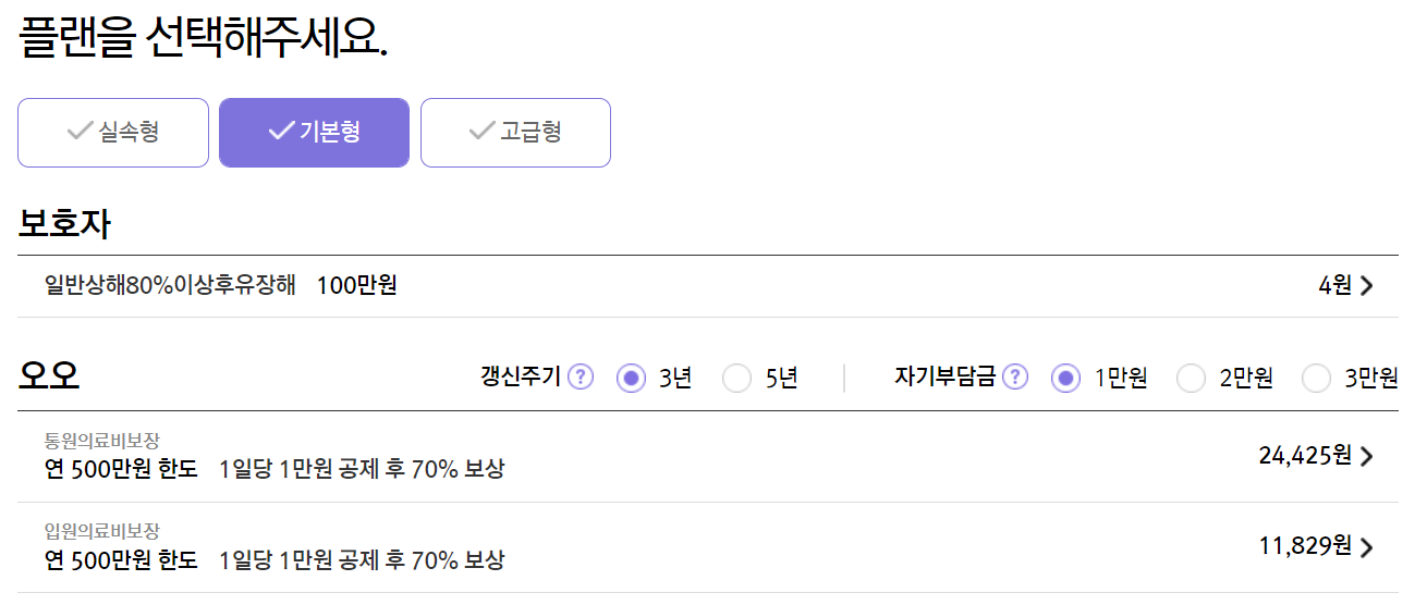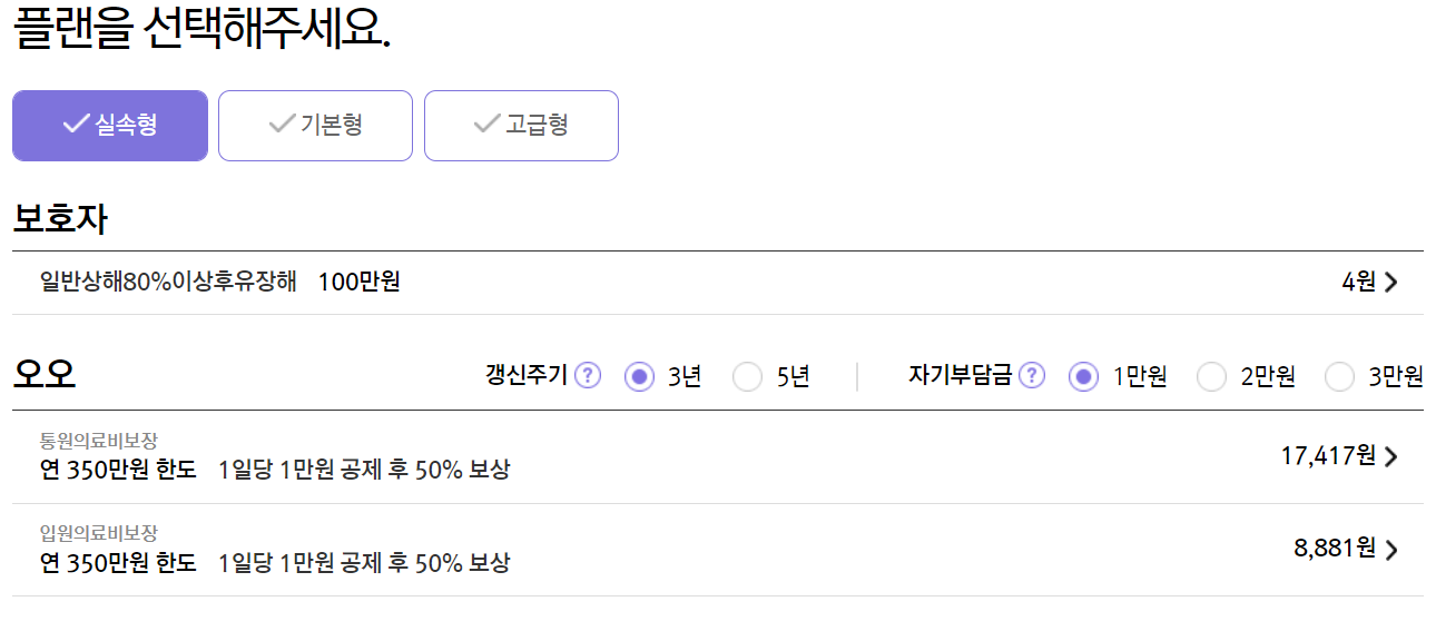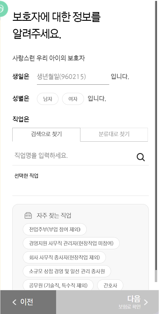보호자 정보를 입력합니다. 그럼 바로 다음과 같이 보험료가 조회되며 보험료는 플랜 등 여러 사항에 따라 달라집니다.