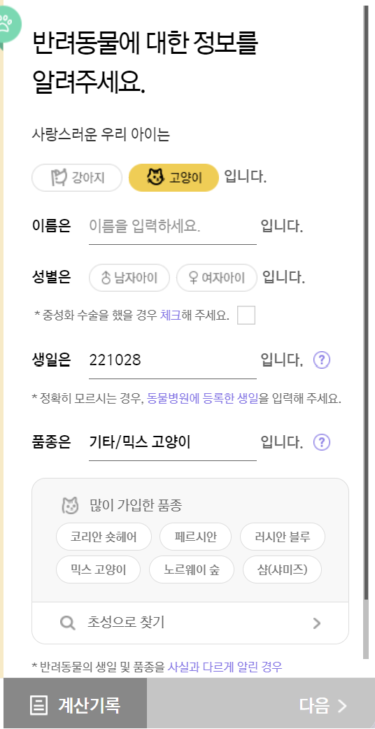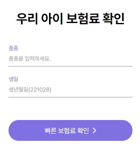 우선 품종 및 생일을 입력 후 빠른 보험료 확인을 클릭합니다.