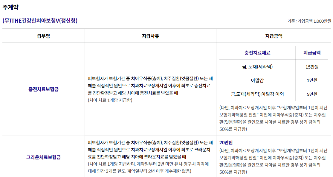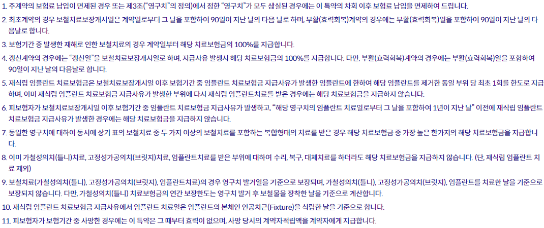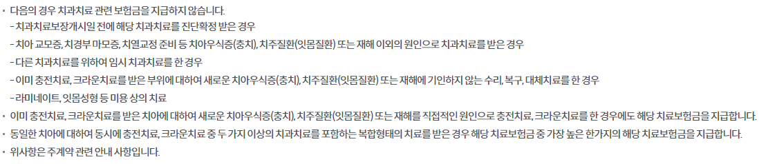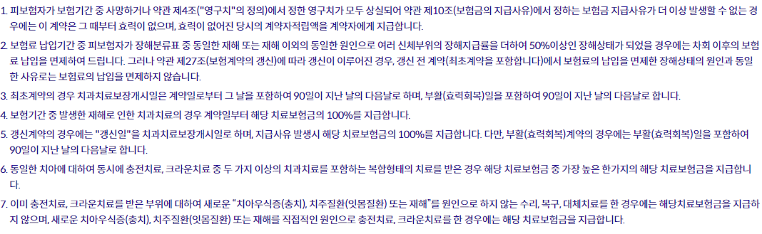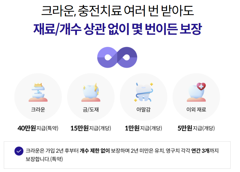 치아보험은 보험금이 지급되는 치아의 개수가 정해져 있습니다 . 예를 들어, 충치치료는 1년에 4개, 크라운치료는 1년에 2개, 임플란트는 평생에 2개 등으로 제한됩니다. 그러므로 치아보험은 자신의 치아 상태와 필요한 치료를 고려하고 가입하는 것이 좋습니다.