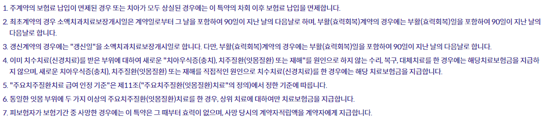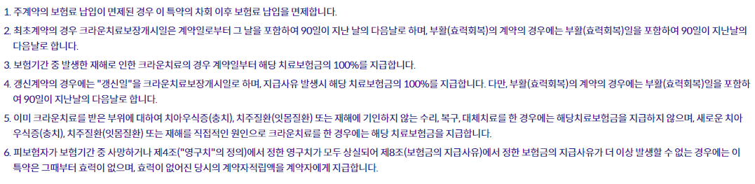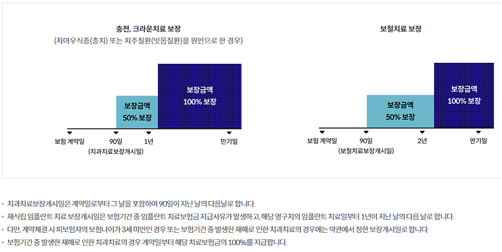 면책 기간이란 보험 가입 후 일정 기간 동안 보장이 되지 않는 기간을 말합니다. 치아보험의 경우 보험 가입 후 90일이 면책 기간입니다 . 즉, 보험 가입 후 90일 이내에 치료를 받으면 보험금을 받을 수 없습니다. 그러므로 치아보험은 미리미리 가입하는 것이 좋습니다.