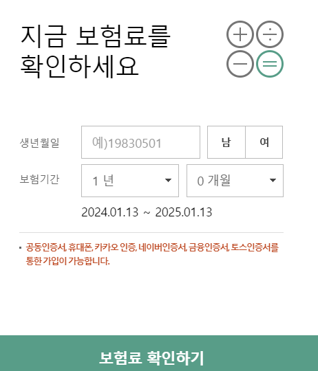 우선 생년월일 성별, 보험기간을 선택합니다.