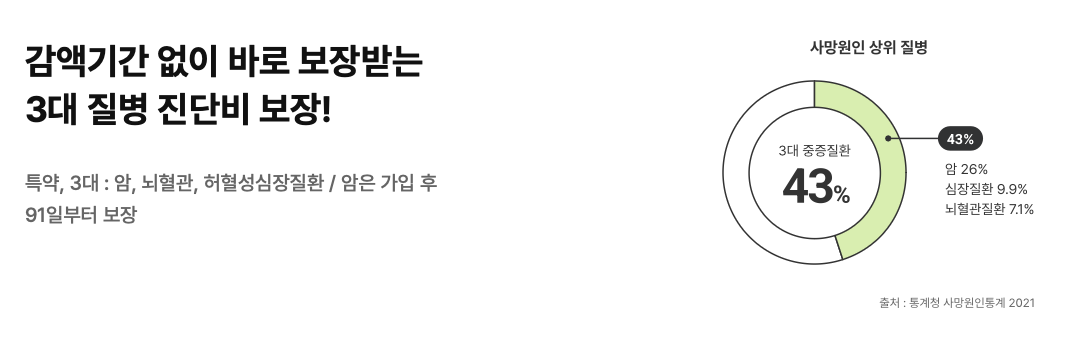 - 3대질병 진단비를 감액·면책없이 보장합니다. 암, 뇌혈관질환, 심장질환 진단 시 가입 즉시 100% 보장받을 수 있습니다.