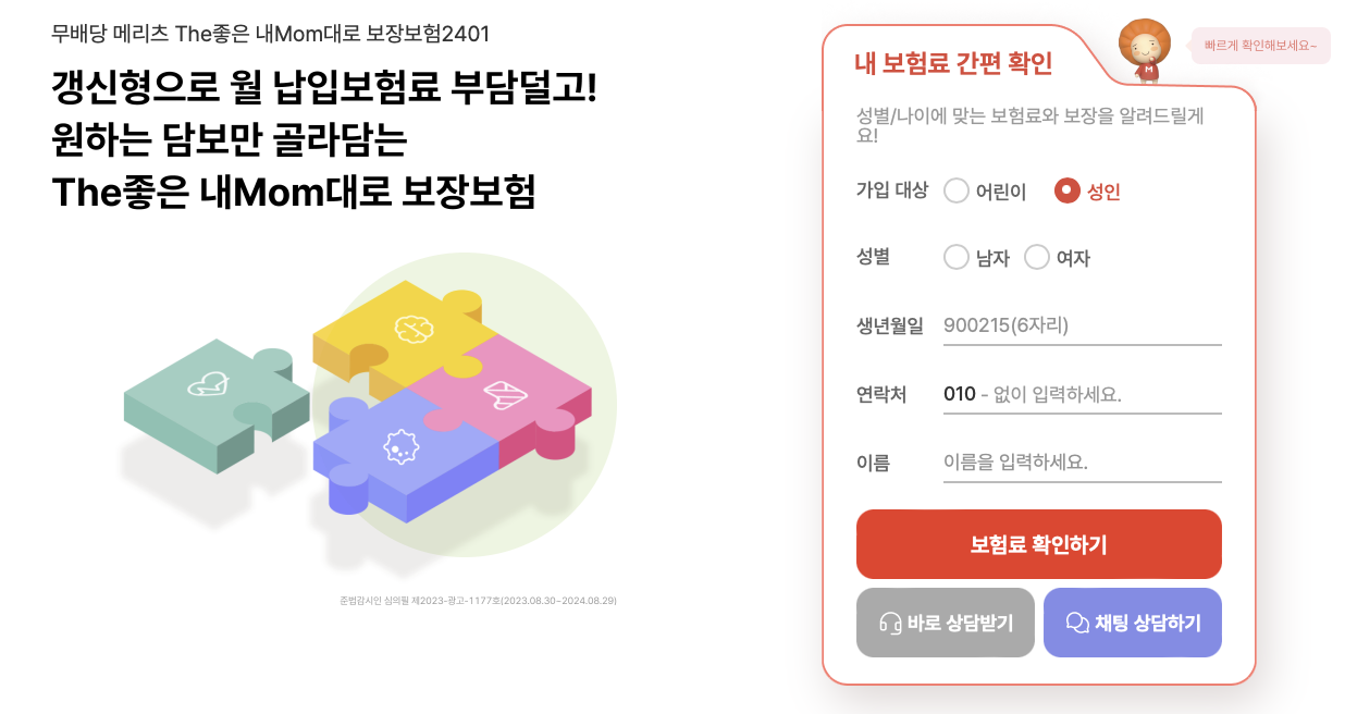 - 메리츠화재 공식 홈페이지 또는 모바일 앱에서 "The좋은 내 MOM대로 보장보험"을 검색하여 보험료를 조회합니다.
