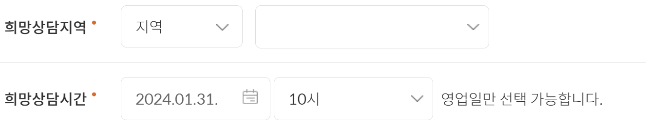 입력 후 원하는 지역에 희망 상담시간 입력 후 상담접수를 하면 상담을 받을 수 있습니다.