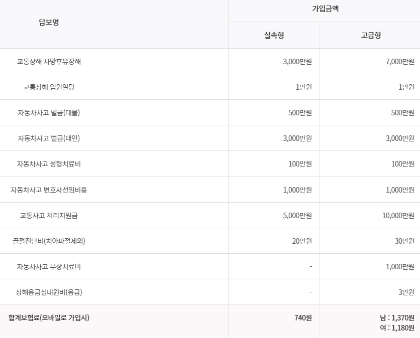 하나손해보험 원데이 운전자보험 보장내용