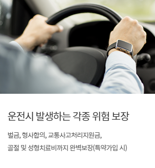 운전중 발생한 사고로 타인의 신체에 상해를 입혀 피보험자가 형사합의금으로 지급한 금액을 보상 | 사망 : 보험가입금액 중대법규위반시