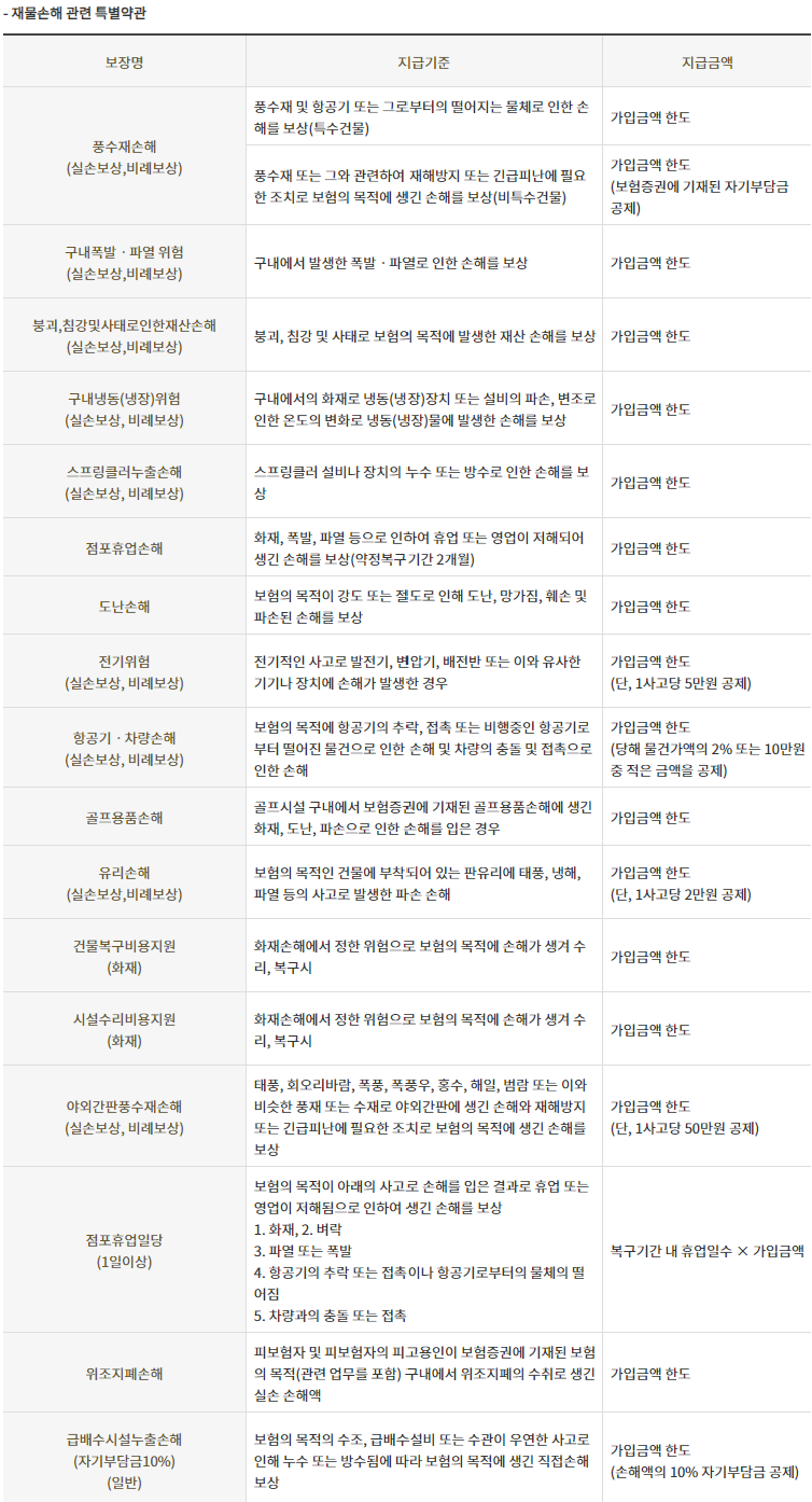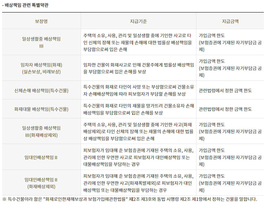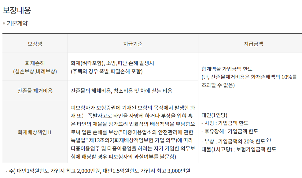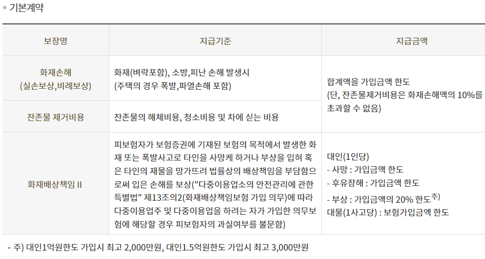 - 화재배상책임(기본계약)은 다수 계약 시 실손 비례보상됩니다.