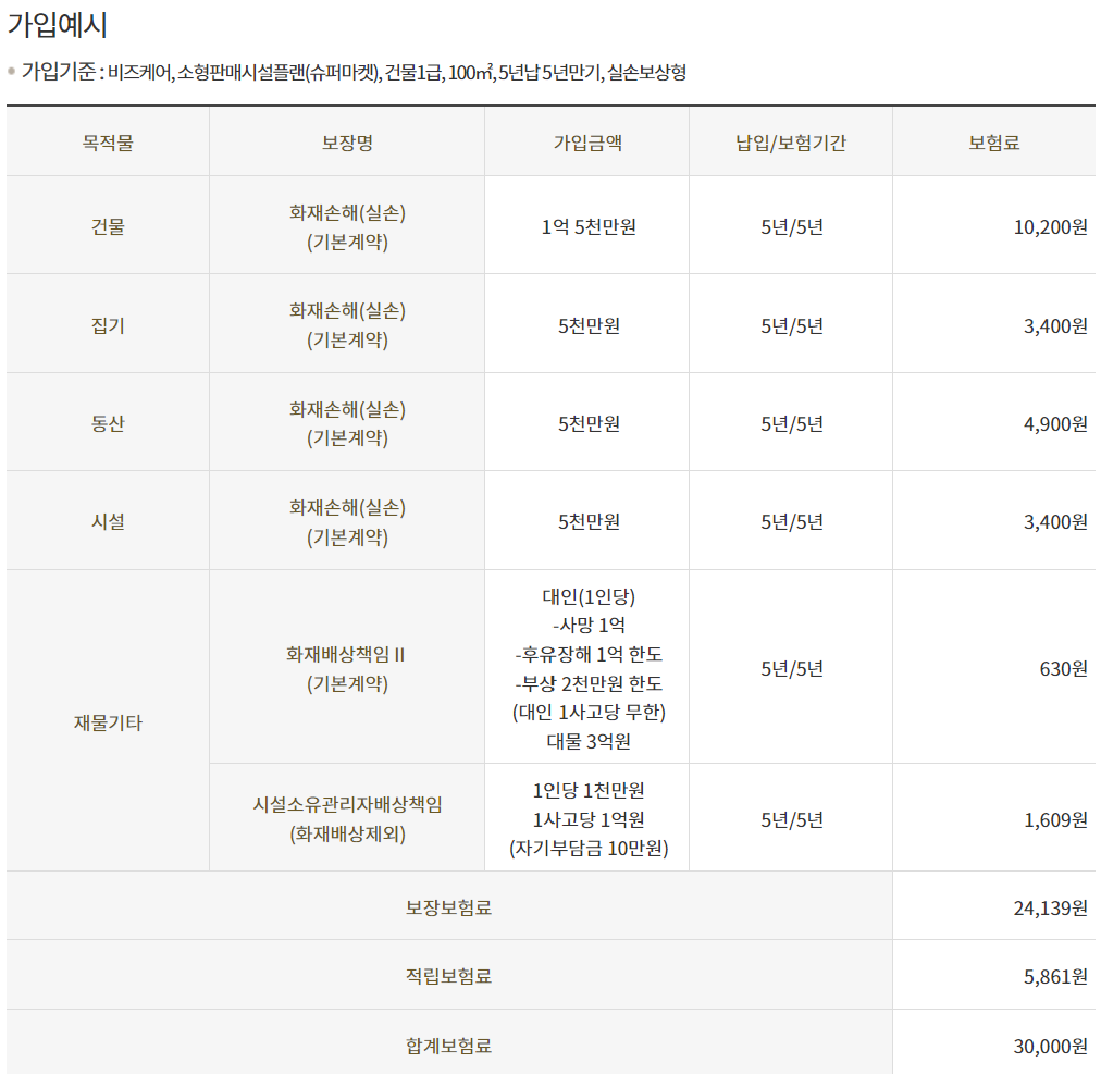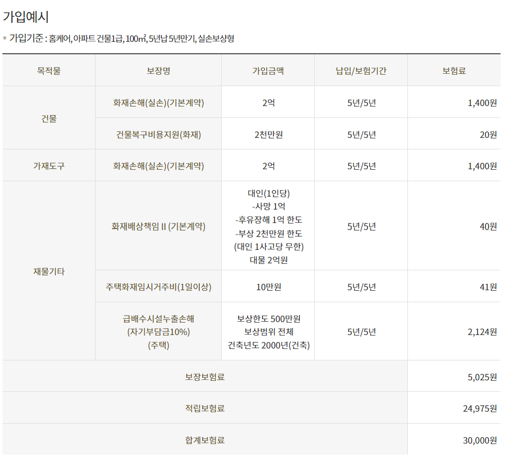 - 위 보험료는 가입예시기준으로 산출된 보험료로서 가입 물건, 직종, 납기, 만기 등에 따라 달라질 수 있음을 알려드립니다.