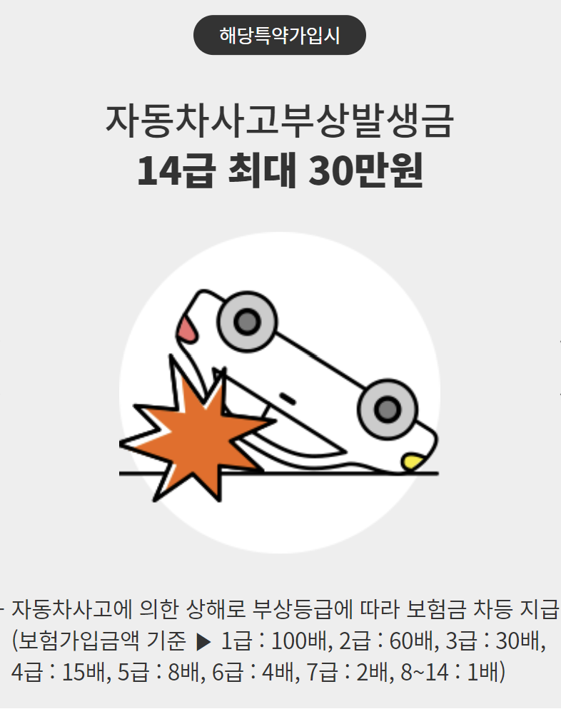 - 일반교통사고로 자배법에서 정한 부상등급 4급 내지 7급에 해당하는 부상을 입히고 경찰서 또는 검찰청에 제출된 의사 진단서 또는 소견서 상 중상해인 경우 1인당 약관에 정한 금액 한도(단, 피보험자와 피해자간 형사합의로 인하여 경찰 조사 후 불송치된 경우 또는 검찰에 의해 불기소된 경우에 한함)