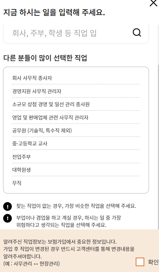 생년월일, 성별, 자가용인지 , 영업용인지 선택합니다. 다음은 직업정보를 입력합니다.
