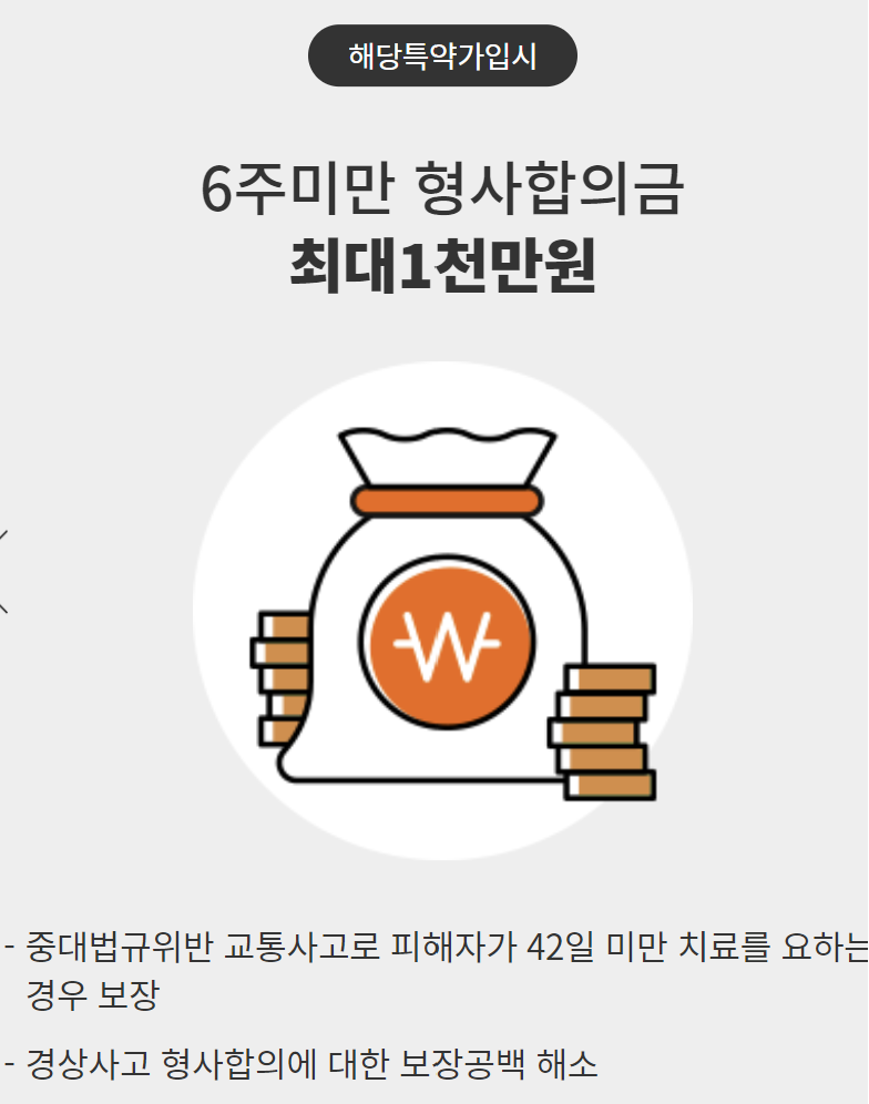- 중대법규위반사고로 42일이상 치료를 요한다는 진단을 받은 경우 진단주수별 약관에 정한 금액 한도(※ 중대법규위반사고 중 스쿨존 어린이 교통사고에 한해 42일미만 치료를 요한다는 진단을 받은경우 피해자 1인당 최대 500만원 한도)
