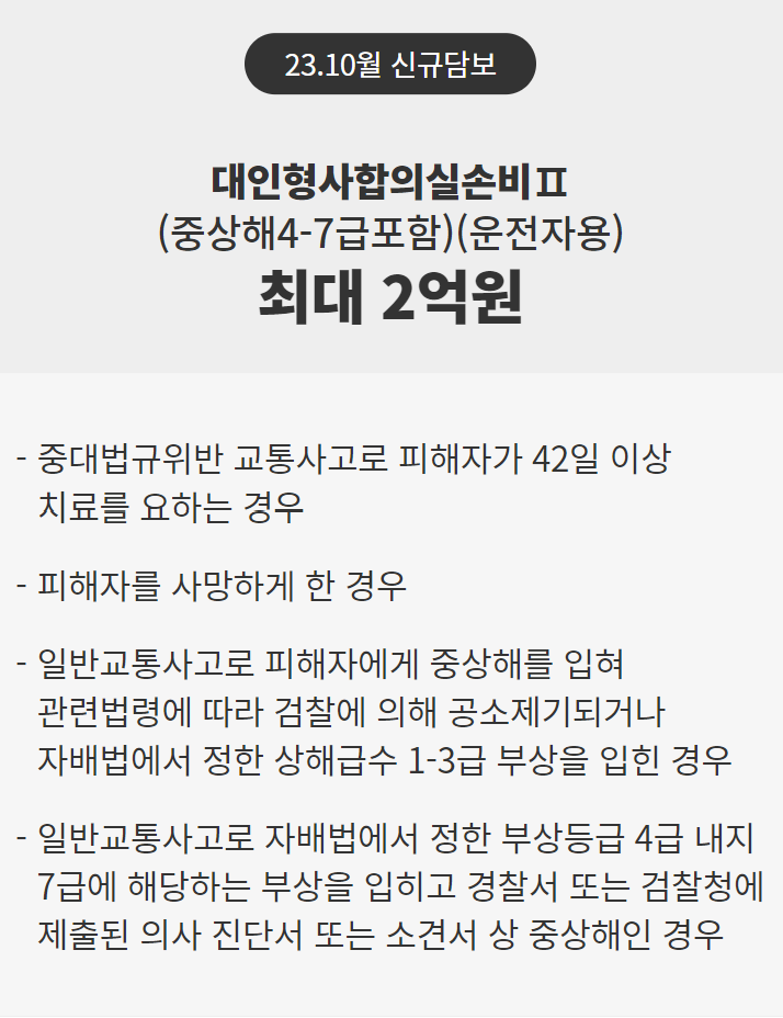 대인형사합의실손비Ⅱ(중상해4-7급포함) (보험가입금액 - 2억원)운전자용자동차 운전중 사고로 타인(피보험자의 부모,배우자,자녀제외)에게 다음 중 어느 하나에 해당하는 손해를 입힌 경우 형사합의금으로 지급한 금액 실손보상