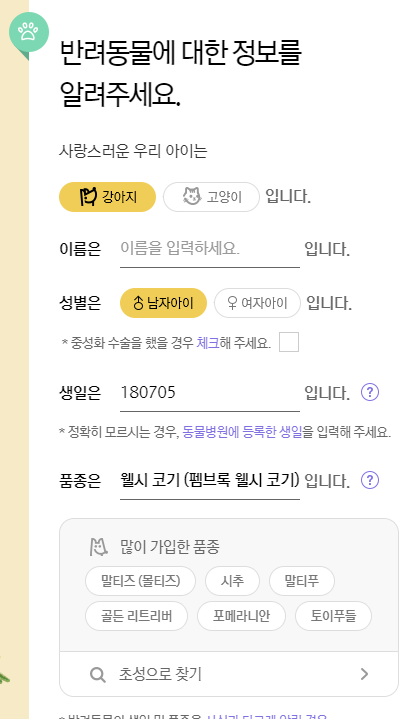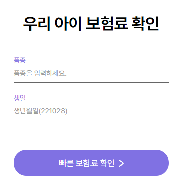 보험료 조회는 간단하게 가능합니다. 우선 아이의 품종 및 아이의 생년월일을 입력합니다.