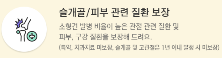 - 보장개시일을 포함하여 1년 이내에 발생한 슬관절, 고관절 관련 질병 및 상해에 대하여 보장하지 않습니다. 단, 갱신 계약의 경우는 적용하지 않습니다.