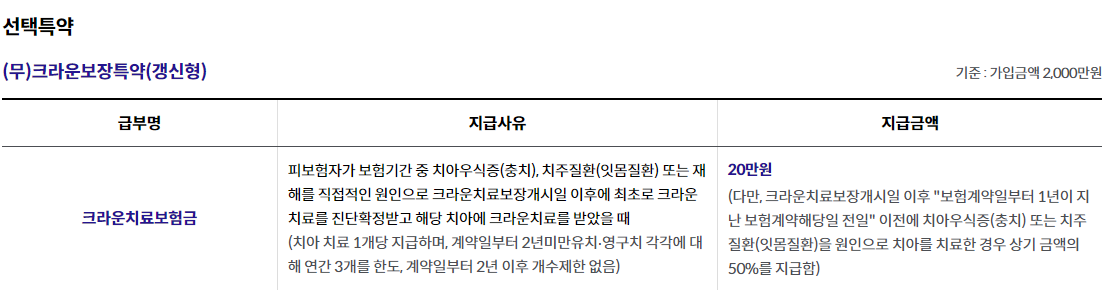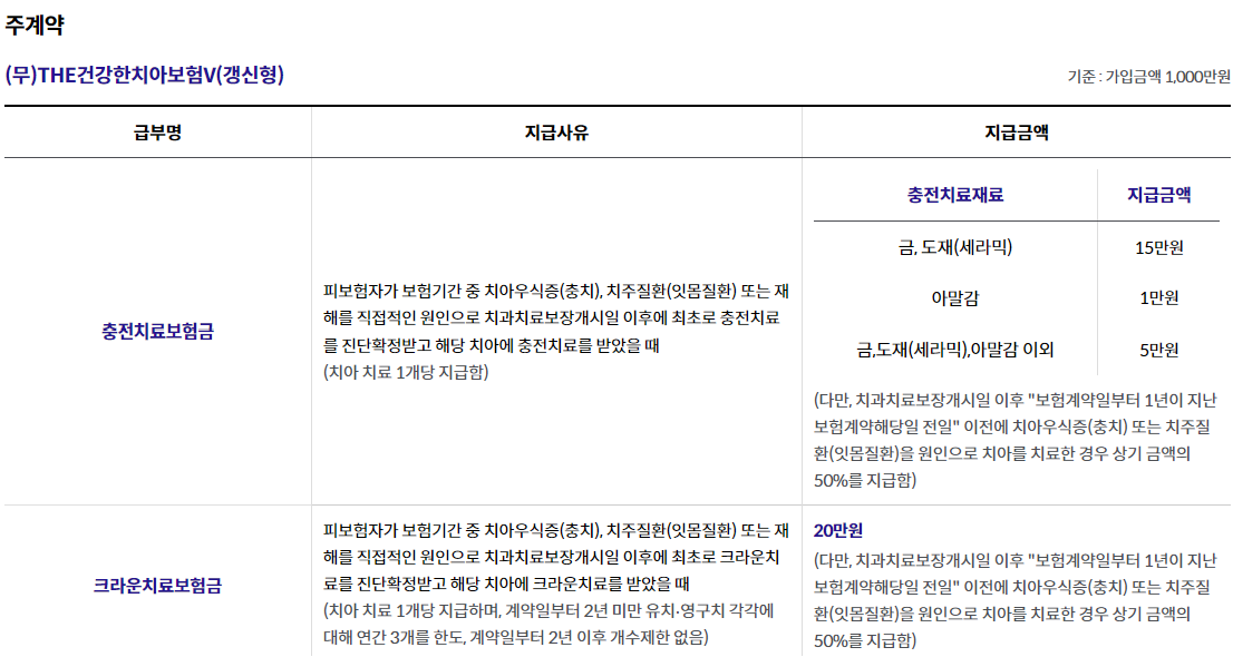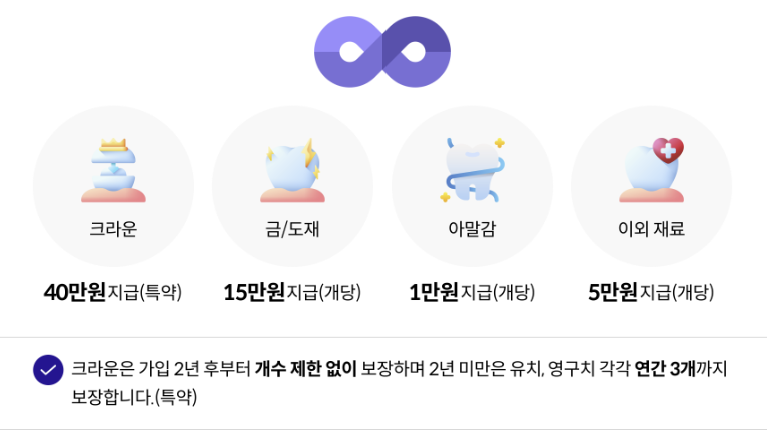 - 동일한 치아에 대하여 동시에 충전치료, 크라운치료 중 두 가지 이상의 치과치료를 포함하는 복합형태의 치료를 받은 경우 해당 치료보험금 중 가장 높은 한가지의 해당 치료보험금을 지급합니다.