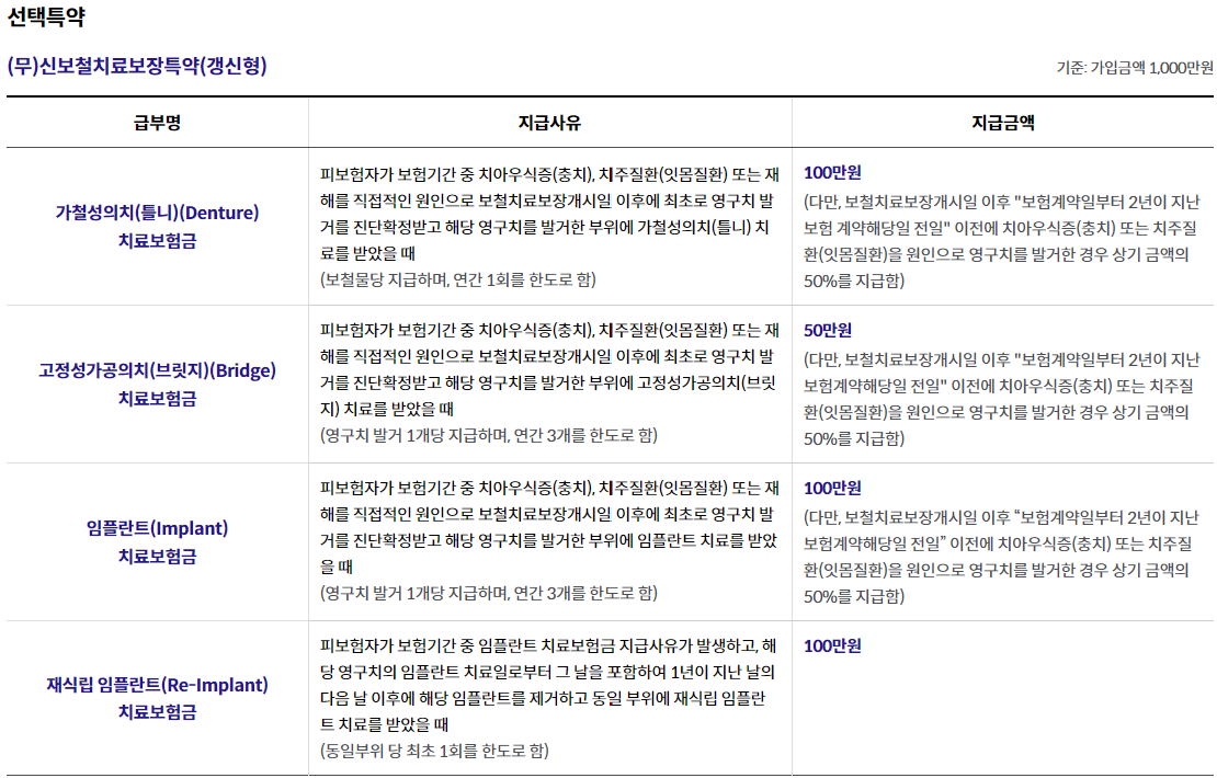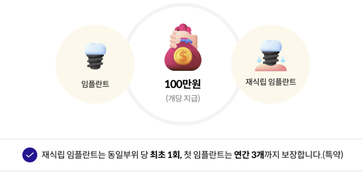 - 재식립 임플란트 치료 보장개시일은 보험기간 중 임플란트 치료보험금 지급사유가 발생하고, 해당 영구치의 임플란트 치료일부터 1년이 지난 날의 다음 날로 합니다.