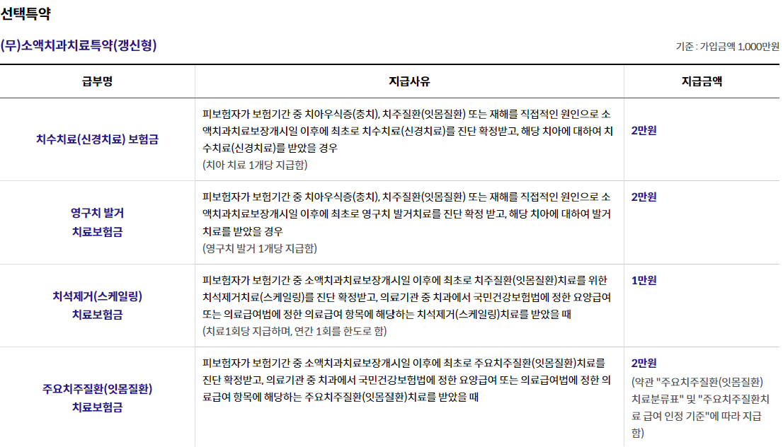 - 보험기간 중 발생한 재해로 인한 치과치료의 경우 계약일부터 해당 치료보험금의 100%를 지급합니다.