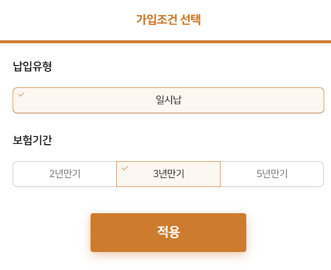 가입조건을 선택합니다. 적용을 누르면 바로 보험료가 계산됩니다.