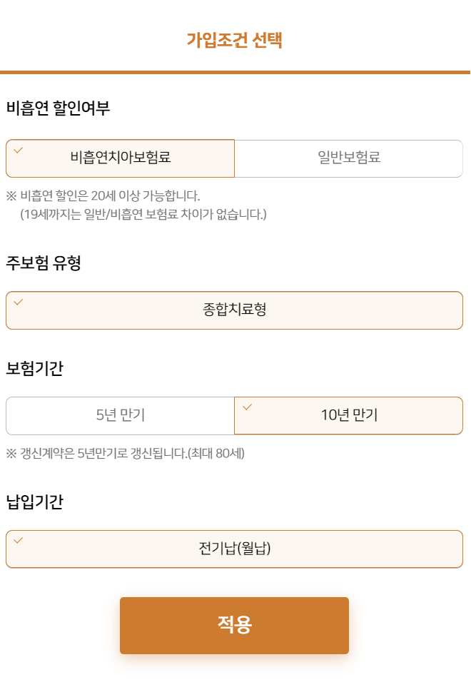 가입조건을 선택하고 적용을 누르면 아래와 같이 보험료가 조회됩니다.