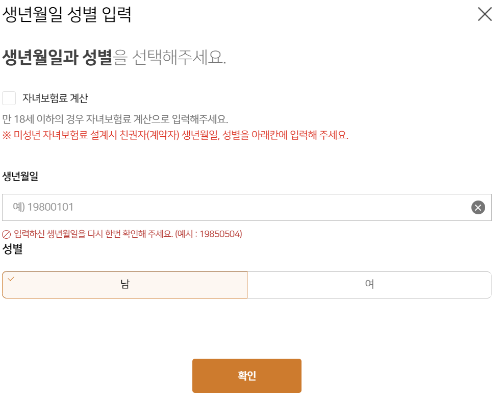 보험료 조회방법은 간단합니다. 생년월일 성별 입력 후 확인을 누릅니다.