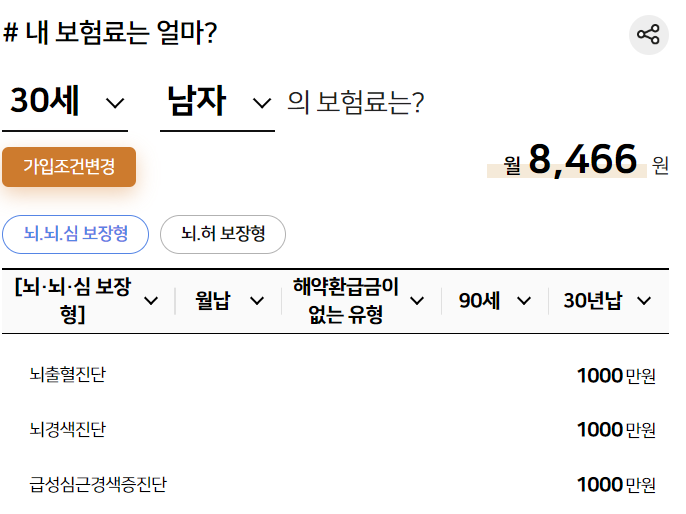 보험료는 사람마다 , 보장마다, 납입기간, 보장나이, 상품유형 등에 따라서도 달라지기 때문에 직접 조회해보시면서 보장내용 등을 알아보는 것이 좋습니다.