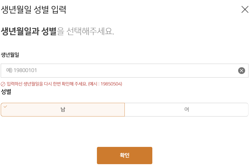 보험료 조회방법은 간단합니다. 생년월일 및 성별을 입력 후 확인을 누릅니다.