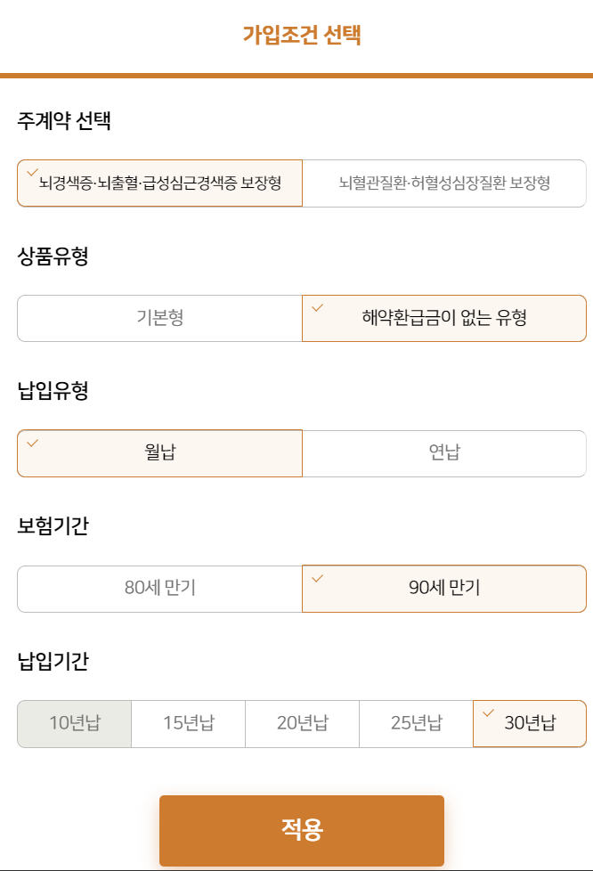 원하는 가입조건을 선택합니다. 적용을 누르면 바로 아래와 같이 보험료가 조회됩니다.