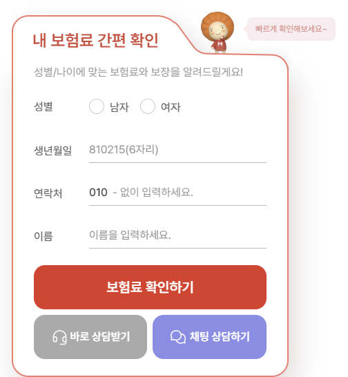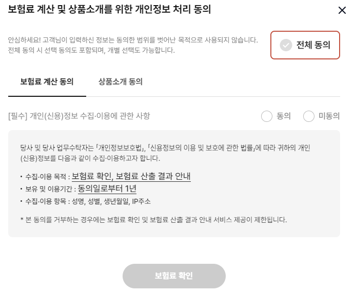 보험료 조회는 간단하게 가능합니다. 먼저 신청자분의 정보를 입력 후 보험료 확인하기를 클릭합니다.
