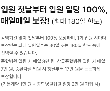 | 갱신형 종합병원 입원일당(1일 이상 30일한도)(간편가입) | 일반 상해 또는 질병으로 종합병원에 입원하여 치료를 받은 경우 최초 입원일로부터 입원 1일당 (1회 입원당 30일 한도) | 2만 원 |