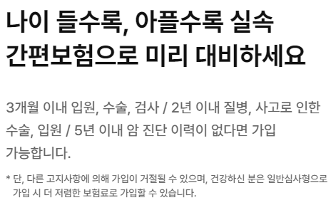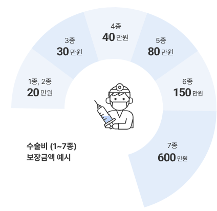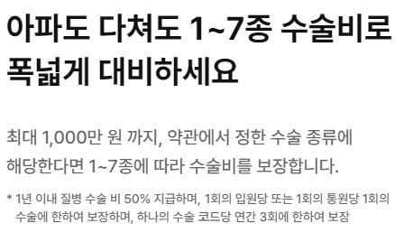 | 갱신형 수술비(1~7종, 연간 3회한)[질병](간편가입) | 질병의 직접적인 치료를 목적으로 약관에서 정한 수술을 받을 경우 ※ 1회의 입원당 또는 1회의 통원당 1회의 수술에 한하여 보장하며, 하나의 수술 코드당 연간 3회에 한하여 보장 ※ 동일한 수술코드에 대한 보험금 지급은 직전 퇴원/통원일의 다음날부터 다음 입원일 또는 통원일까지 30일이 경과해야 함 ※ 단, 최초 가입 후 1년 이내 질병의 직접적인 치료를 목적으로 수술 시 50% 지급 |