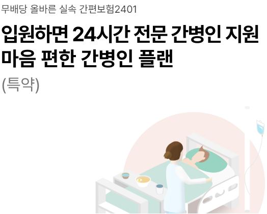 | (3년)갱신형 간병인 입원일당(Ⅱ)(1-30일한)(간편가입) | 일반상해 또는 질병으로 입원하여 치료를 받을 때 입원 1일마다 간병인을 지원하거나 간병인을 지원받지 않으면 최초 입원일부터 입원 1일마다 입원일당 가입금액 지급, 단 간호간병통합서비스 사용시 입원일당 가입금액의 2배 지급(1회 입원당 30일한도, 간병인을 지원받으면 입원일당 및 간호간병통합서비스 사용 입원일당을 지급하지 않음) | 간병인지원 또는 입원일당 1만 원 또는 간호간병 통합서비스사용 입원일당 2만 원 |
