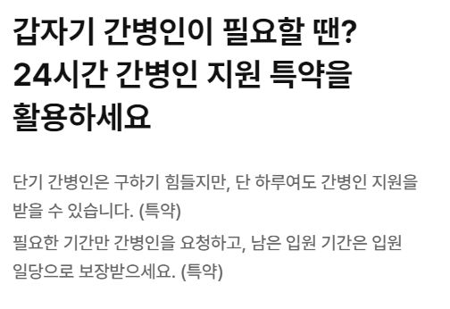 간병인 보험은 기본적으로 간병인의 비용만을 보장해주지만, 추가적으로 다른 혜택이나 특약을 가입할 수도 있습니다. 예를 들어, 간병인 외에도 생활비를 지원해주는 특약이나, 상급종합병원 1인실 입원일당을 함께 가입할 수 있습니다 . 이러한 혜택이나 특약은 본인의 입원비용이나 생활비를 줄여주거나, 편안하고 쾌적한 병원 생활을 도와줄 수 있습니다. 하지만, 이에 따라 보험료가 증가할 수 있으므로, 자신의 예산과 우선순위에 따라 필요한 혜택이나 특약을 선택하는 것이 좋습니다.