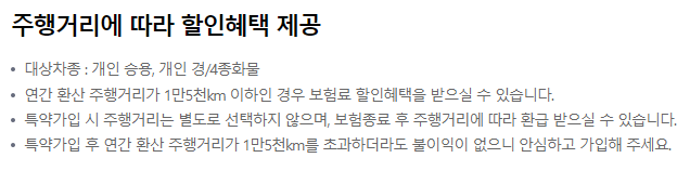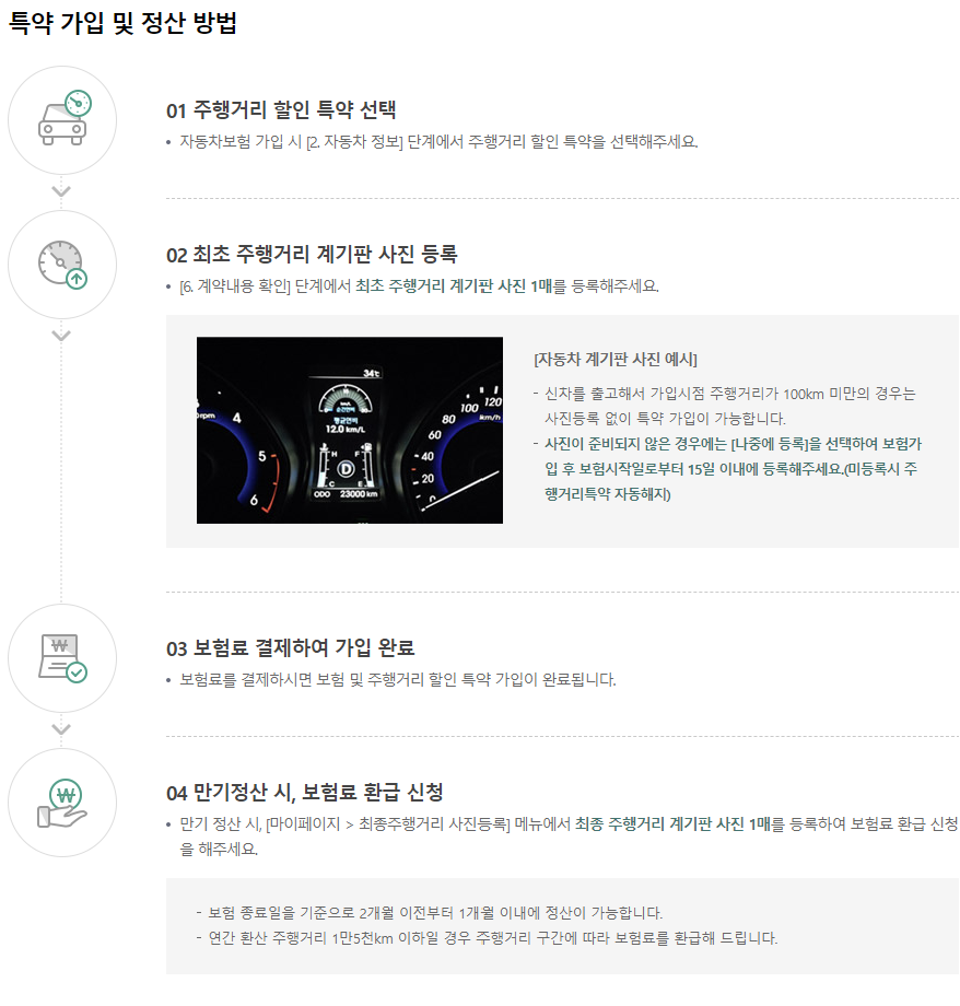 - 주행거리 할인 특약은 주행거리 후 할인(사진전송) 방식으로 보험기간 종료시점에 환급해 드리는 특약입니다. 가입 시 주행거리 계기판 사진 1매를 등록해야 합니다.