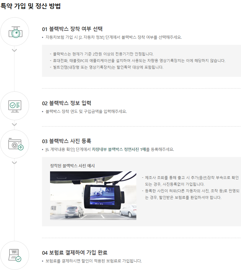 - 가입 시 차량내부 블랙박스 정면사진 1매를 등록해야 합니다.