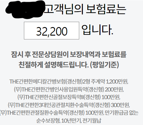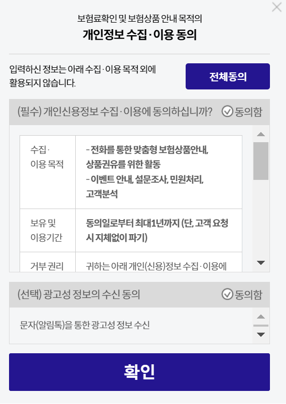 보험료 확인을 위한 개인정보 수집 및 이용에 동의 후 확인을 클릭하면 바로 다음과 같이 보험료가 조회됩니다.