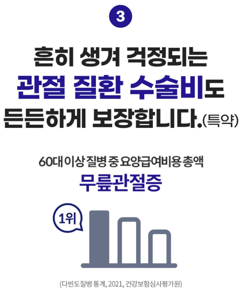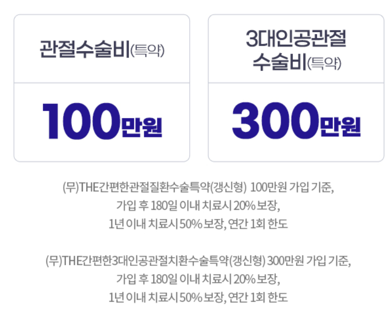 9. “3대 인공관절치환수술”은 질병 또는 재해로 손상된 슬관절(무릎관절), 고관절(엉덩이관절), 견관절(어깨관절)의 전부 또는 일부를 제거하고 인공관절을 삽입하여 치환하는 수술을 말합니다.