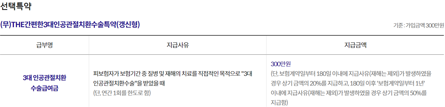 6. ‘3대 인공관절치환 수술급여금’은 연간 1회 한도로 지급하며, 이 때 ‘연간’이란 보험계약일부터 매 1년마다 도래하는 보험계약해당일 전일까지의 기간을 의미합니다.