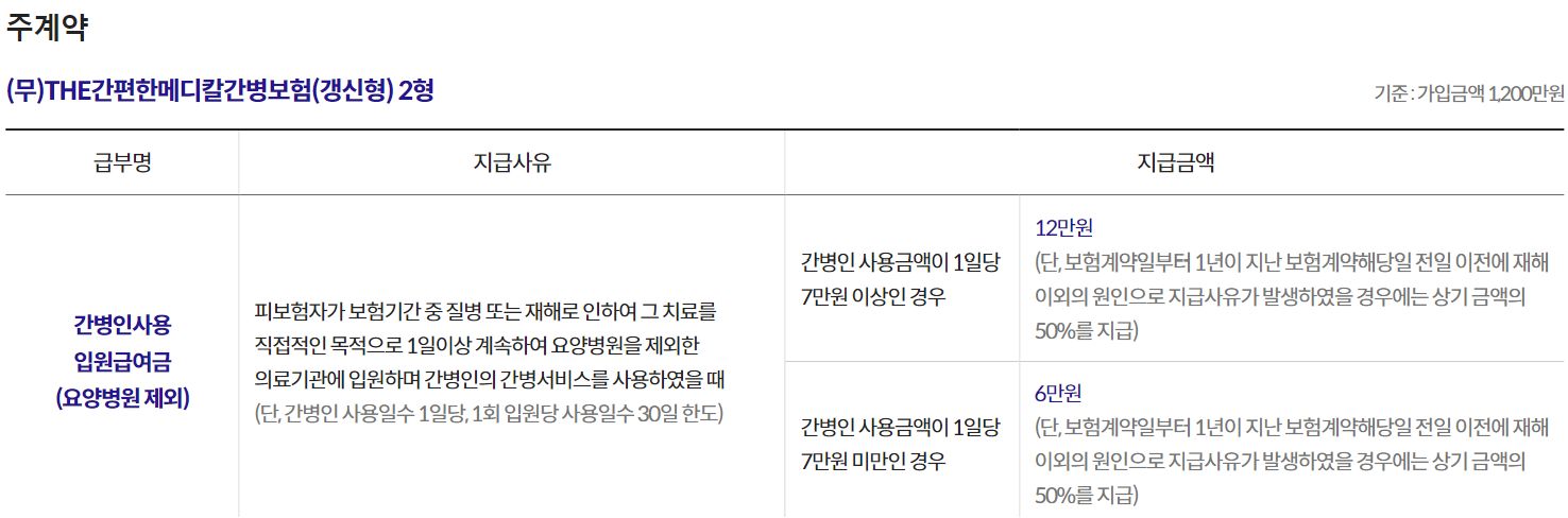 4. 3)에도 불구하고 재해 이외의 원인으로 인한 보험금의 지급사유가 보험계약일부터 1년이 지난 보험계약해당일 전일 이전에 발생하였다 할지라도 간병인 또는 간호∙간병통합서비스 사용일이 보험계약일부터 1년 이후까지 계속되었을 경우, 1년 미만의 기간에 대하여는 간병인 또는 간호∙간병통합서비스 사용일수 1일당 해당 입원급여금의 50%를 지급하며, 1년 이후의 기간에 대하여는 간병인 또는 간호∙간병통합서비스 사용일수 1일당 해당 입원급여금의 100%를 지급합니다.