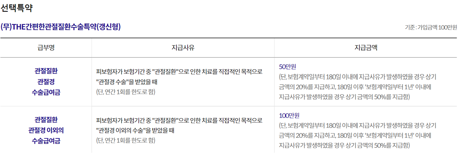 5. ‘관절질환 관절경 수술급여금’, ‘관절질환 관절경 이외의 수술급여금’은 각각 연간 1회 한도로 지급하며, 이 때 ‘연간’이란 보험계약일부터 매 1년마다 도래하는 보험계약해당일 전일까지의 기간을 의미합니다.