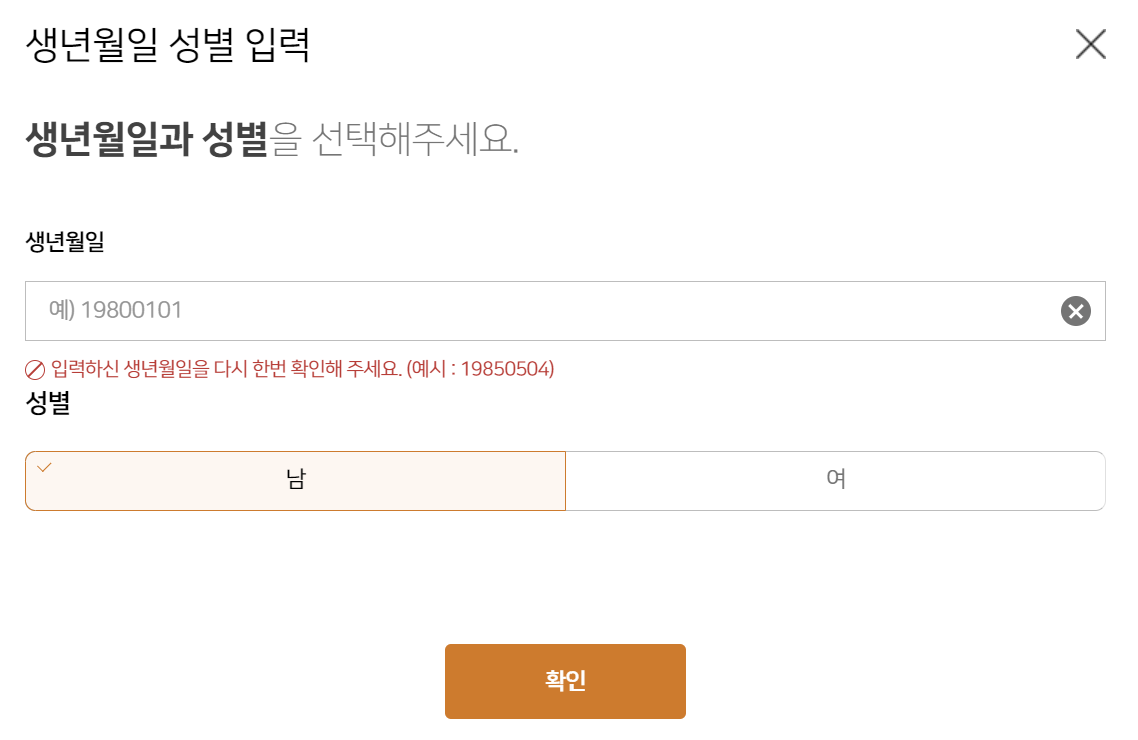 보험료 조회방법은 간단합니다. 생년월일 및 성별을 입력 후 확인을 누릅니다.