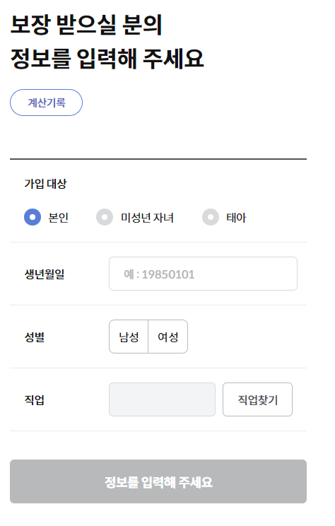 먼저 가입대상, 생년월일, 성별, 직업을 입력 후 보험료 계산하기를 클릭하면 바로 다음과 같이 보험료가 계산됩니다.